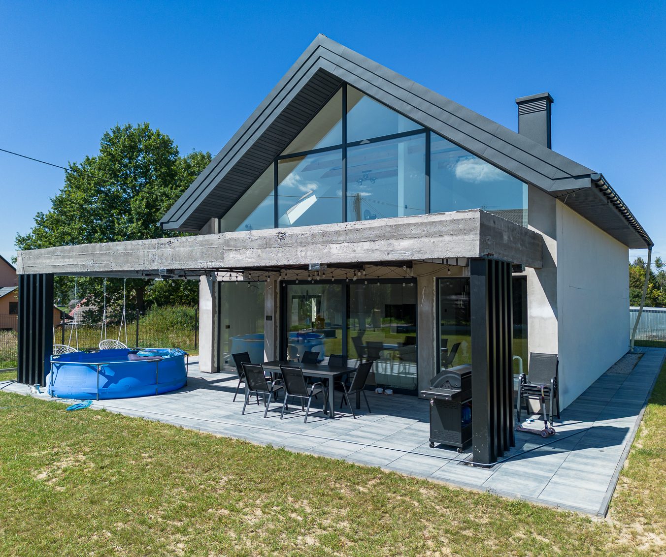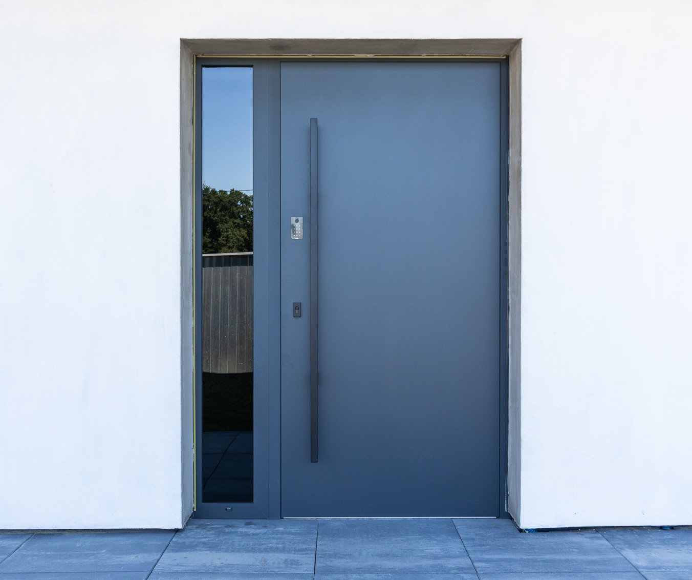W realizacji zastosowano systemy Aliplast Genesis i UltraGlide, a także drzwi wejściowe Genesis z bocznym naświetlem. Naświetle wypełnione zostało szybą Black Planibel oraz wyposażone w elegancki czarny pochwyt. Drzwi zostały wzbogacone o funkcję smart – czytnik Sorex z klawiaturą numeryczną i odciskiem linii papilarnych. Całość konstrukcji została zamontowana w standardzie ciepłego montażu z zastosowaniem podwalin, co zapewnia maksymalną szczelność, energooszczędność i trwałość instalacji.