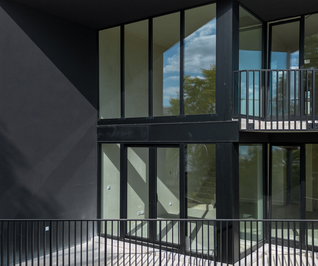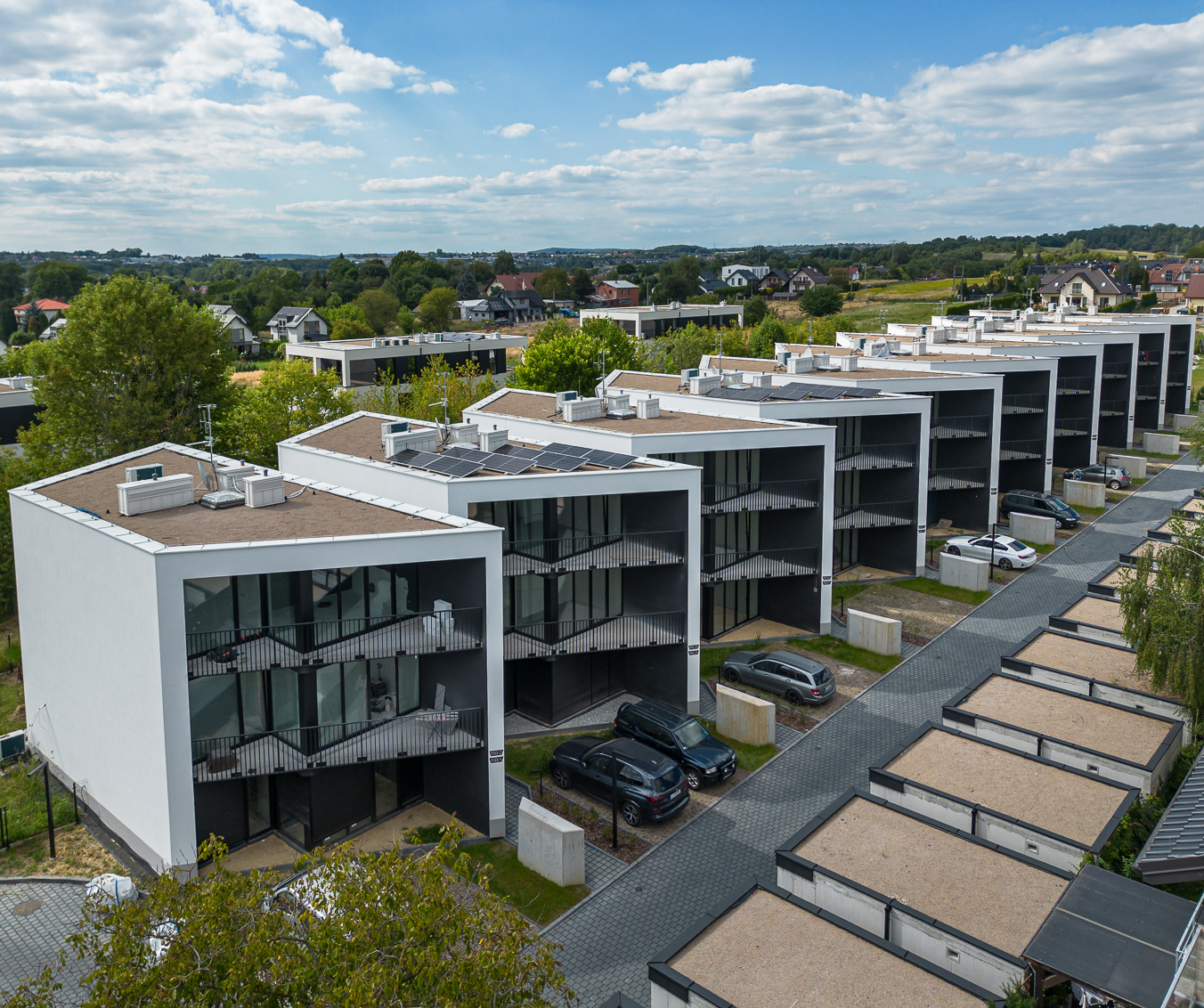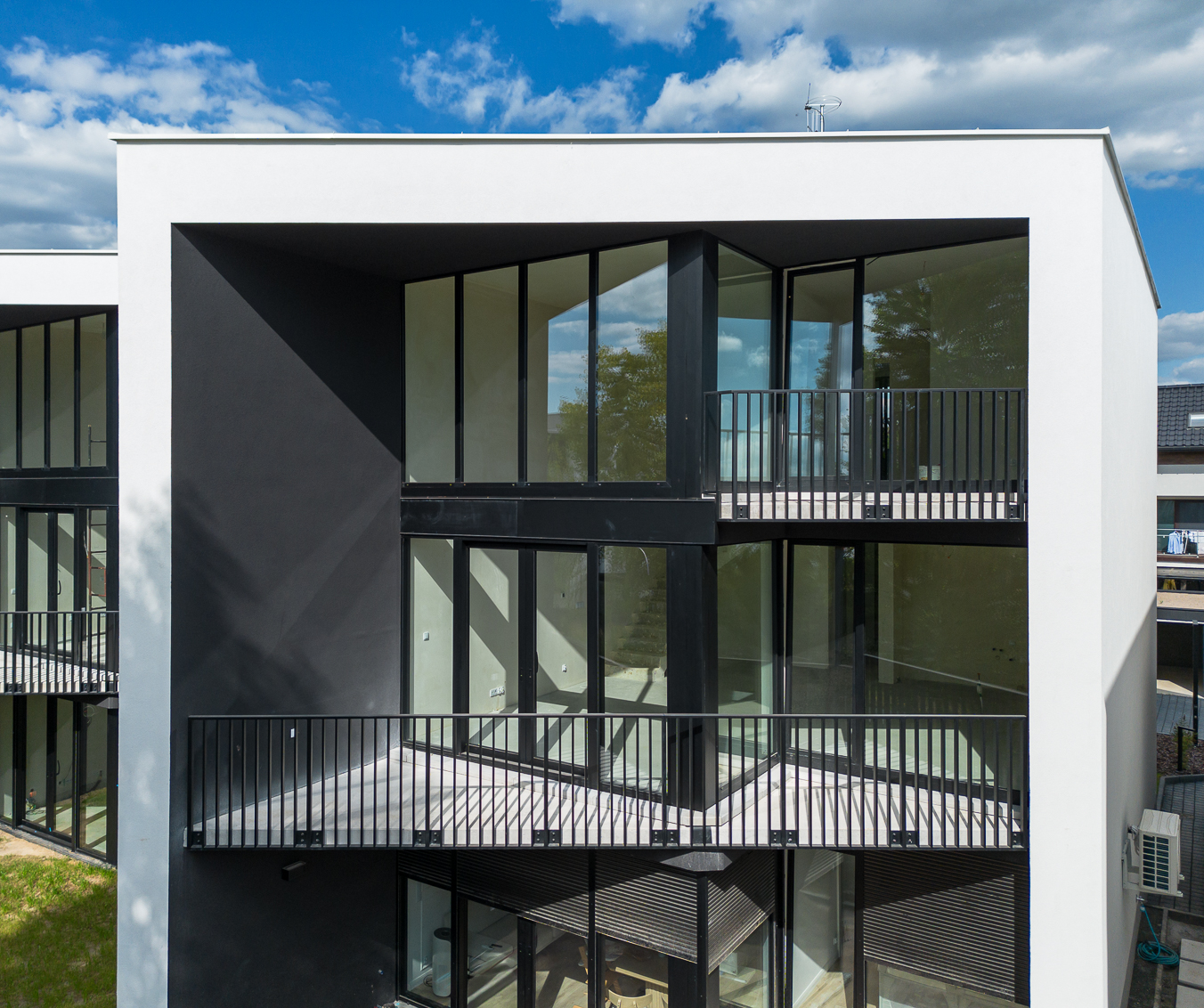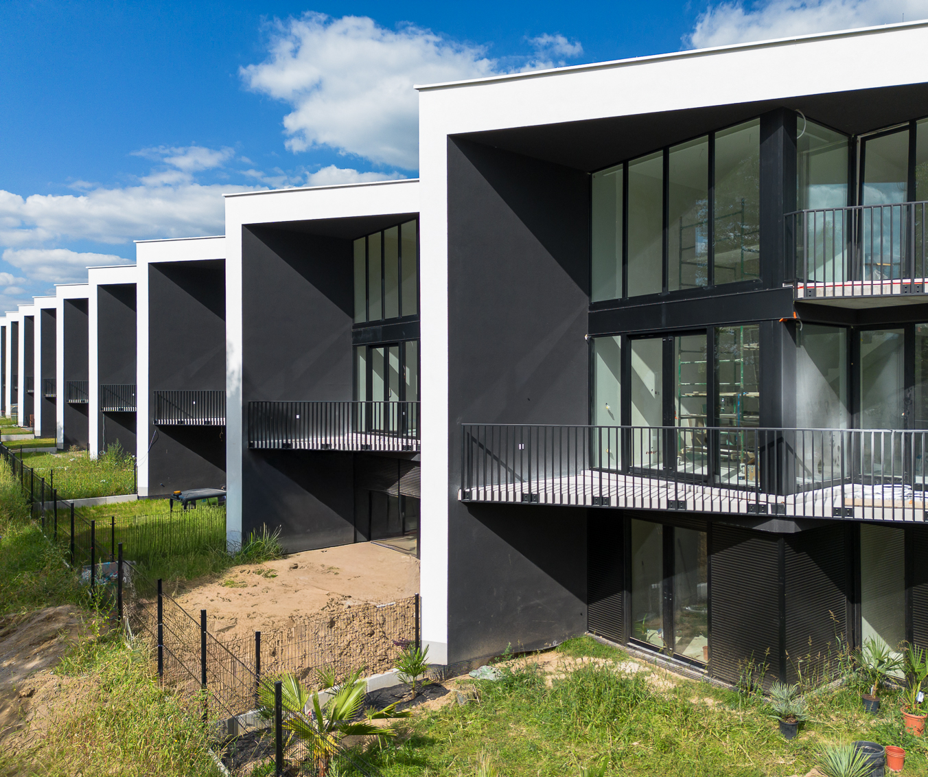 W ramach realizacji wykonano stolarkę aluminiową w systemach Aliplast Genesis oraz Ultraglide w eleganckim kolorze 9005T2. Zastosowano zarówno okna i drzwi, jak i przesuwne konstrukcje HST, które podkreślają nowoczesny charakter osiedla i pozwalają na maksymalne otwarcie przestrzeni mieszkalnych. Drzwi wejściowe wykonano w systemie Genesis z panelem wsadowym, co zapewnia estetykę oraz trwałość. Łącznie zrealizowano około 200 konstrukcji o łącznej powierzchni 1500 m². Montaż obejmował zarówno technologię standardową, jak i ciepły montaż z zastosowaniem podwalin, gwarantując najwyższą jakość izolacji i komfort użytkowania.