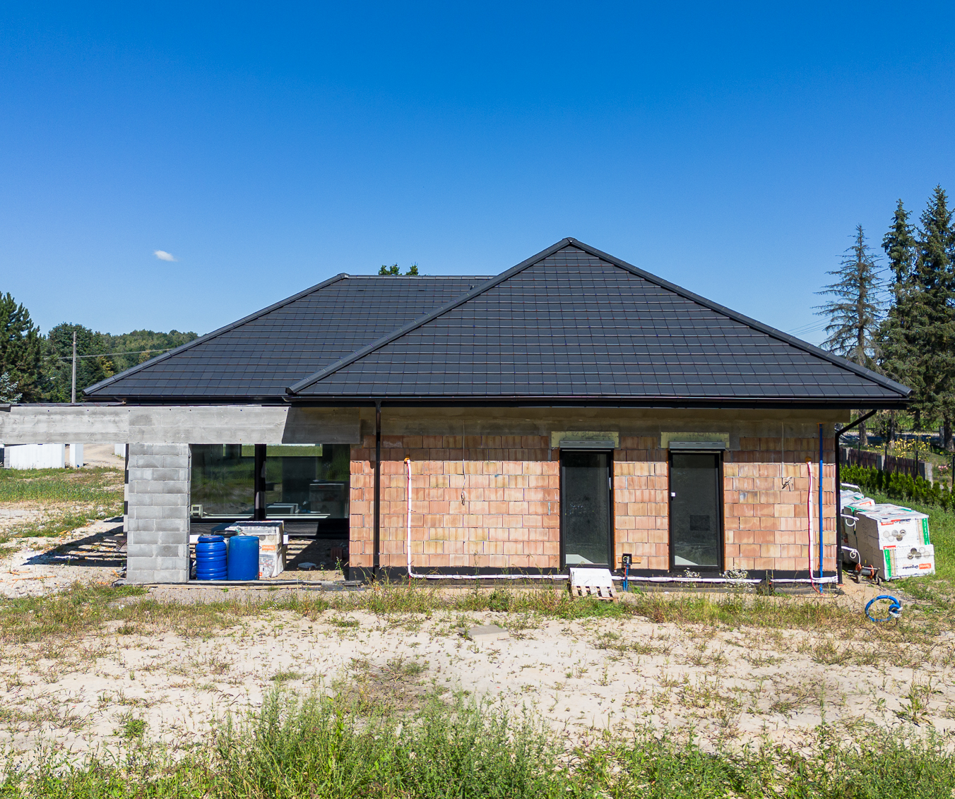 Nowoczesny parterowy dom położony w spokojnej okolicy, w którym eleganckie czarne okna aluminiowe idealnie komponują się z architekturą budynku. Całość uzupełniają drzwi wejściowe panelowe z pochwytem oraz rolety podtynkowe, które zwiększają komfort i bezpieczeństwo mieszkańców. W salonie zastosowano przesuwne okno tarasowe HST z moskitierą plisowaną, zapewniające wygodne wyjście na taras i otwarcie domu na ogród.