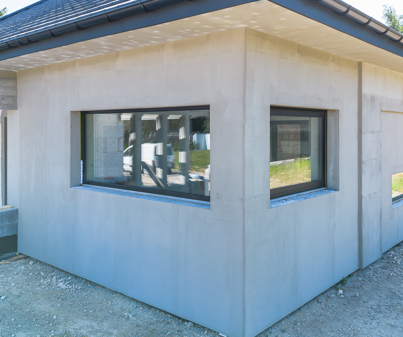 W realizacji zastosowano system okienny Aliplast Genesis, który zapewnia doskonałą izolacyjność i elegancki wygląd profili. Drzwi wejściowe wykonano w wersji panelowej Genesis z nowoczesnym pochwytem, co podkreśla prestiżowy charakter budynku. Wyjście na taras otwiera przestronne okno przesuwne Ultraglide HST, gwarantujące wygodę i pełne doświetlenie wnętrza. Dodatkowo zamontowano rolety podtynkowe Aluprof w kolorze czarnym, które zwiększają prywatność oraz poprawiają efektywność energetyczną domu. Całość uzupełnia montaż standardowy w technologii ciepłego montażu z zastosowaniem podwalin, co zapewnia trwałość oraz maksymalną szczelność stolarki.